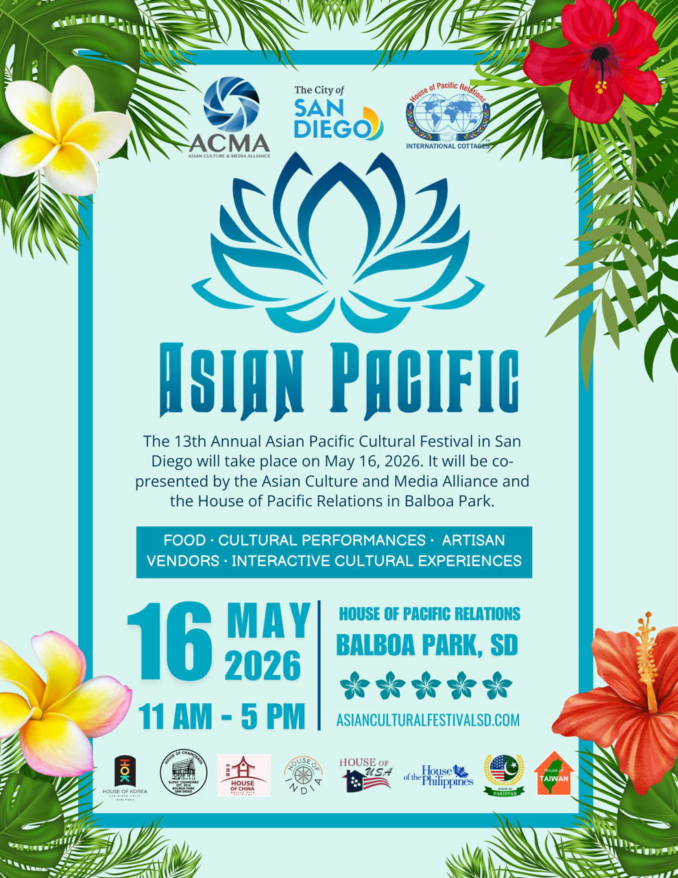 The 13th Annual Asian Pacific Cultural Festival of San Diego will be returning on May 16, 2026! We will be featuring cultural, traditional, and contemporary acts! There will be plenty for everyone at this family-friendly, fun, and FREE event!